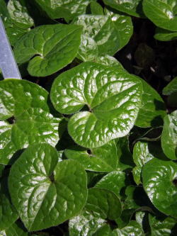 | フタバアオイ Asarum caulescens Maxim 京都上賀茂神社に由来する 貴重植物 ウマノスズクサ科 撮影日:平成30年9月2日 撮影場所:地域の花木園 |